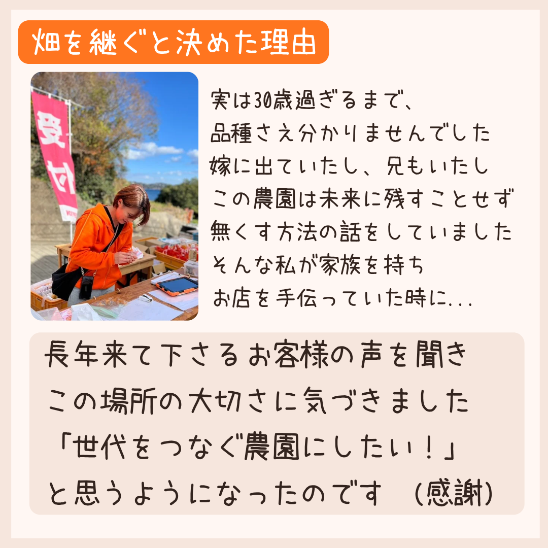 四字熟語は、日本の伝統や文化に根ざした考え方であり、私が大切にしたい価値観を象徴しています。「和の心」を持って、これらの理念を実現し、皆さまに長く愛して頂ける農園を目指します。