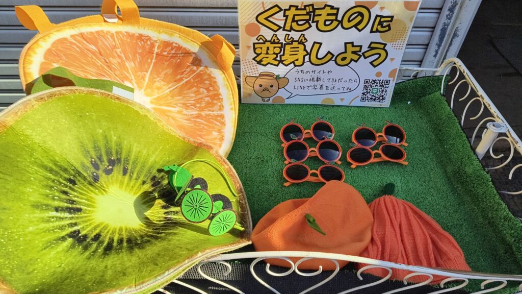自作の顔出しパネルや、子どもも大人も夢中になれる果物コスプレをご用意。たくさんの方が満面の笑顔で写真を撮っている姿を見れて、とても嬉しい日々でした。