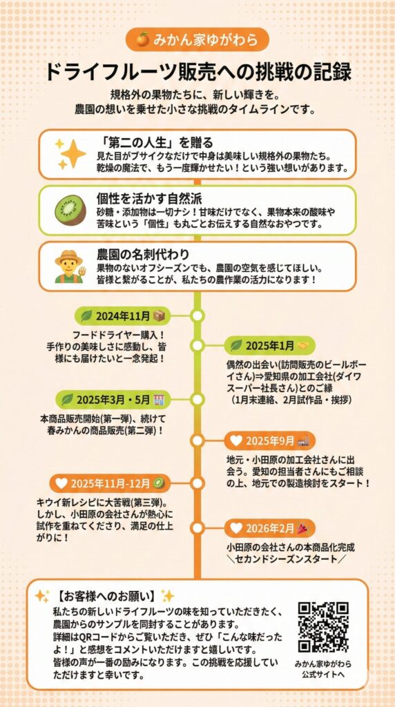 農園には、見た目が少し悪いだけで行き場を失ってしまう『訳あり果物』がたくさんあります。 この子たちを大量にドライフルーツに生まれ変わらせたい!と委託先を探していたところ、2025年に運命的な出会いがあり、愛知県のダイワスーパーさんのお力で無事に第一弾を商品化することができました。